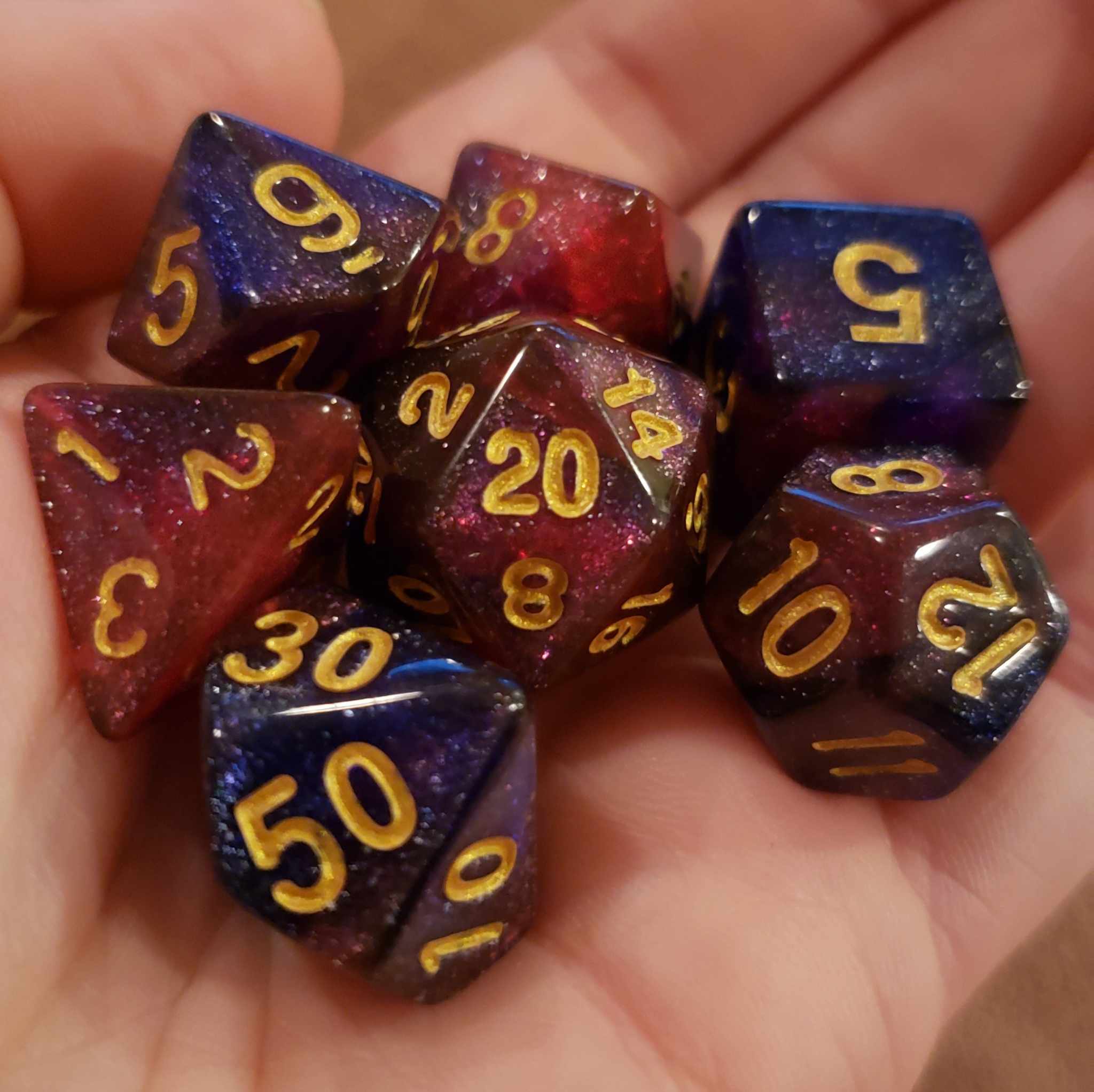 Gaze into the infinite cosmos with the Celestial Spark Dice Set, a breathtaking collection of purple and pink glitter-infused dice that shimmer like starlight in the vast expanse of space. Heavily pigmented and filled with sparkling brilliance, these dice are perfect for adventurers inspired by celestial magic, the mysteries of the universe, or the vibrant glow of distant nebulae. Each roll feels like drawing energy from the stars, making this set ideal for spellcasters, cosmic warriors, or anyone seeking to infuse their game with a touch of otherworldly beauty. Whether you’re playing Dungeons & Dragons, Pathfinder, or any tabletop RPG, this set is sure to enhance your role-playing experience and add a piece of the heavens to your collection. Let your rolls shine as brightly as the stars above and bring a cosmic flair to every campaign.